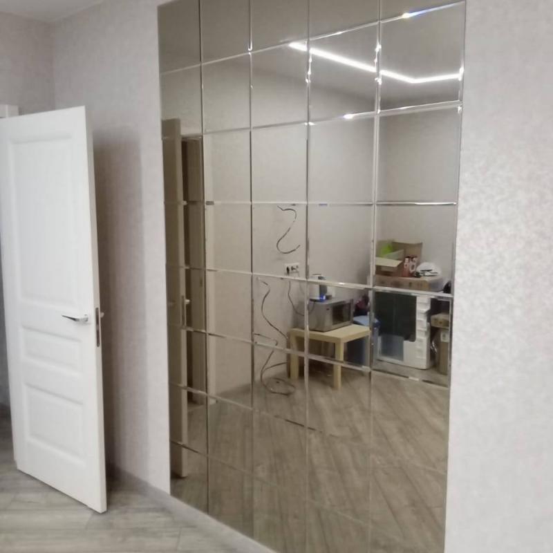 Использована квадратная серебристая зеркальная плитка размером 18х18.